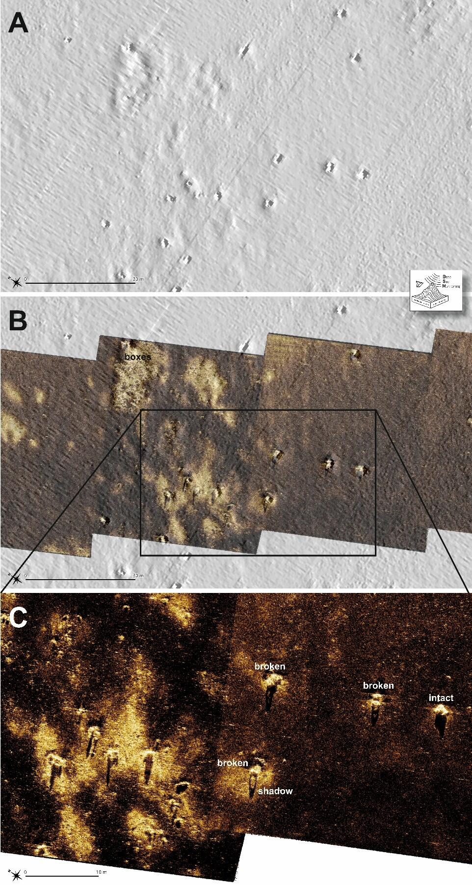 Finally, we also worked in German waters in Lübeck Bay. Here, the targets of a ship-based SAS system were F103 rocket warheads, which we expected to be present based on MBES data. The SAS clearly shows the large (1.4 by 0.7 m) barrel-shaped objects. In some parts, they are completely corroded, and only the large metal rings at each side of the objects still exist, creating large circular shadows in the SAS images.