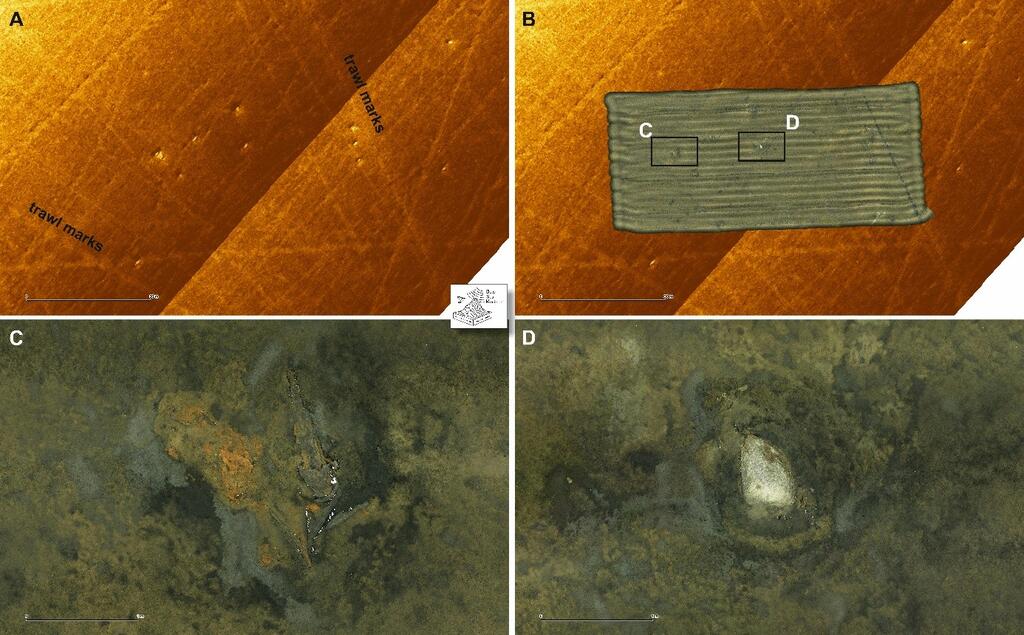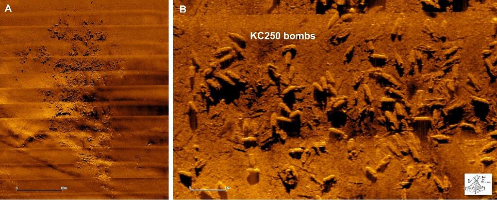 The data clearly show individual KC250 bombs, most of them open, broken, and empty. Some had a ‘strange’ orange seafloor cover next to some of them. Whether this cover represents spilled and partially converted chemicals or specific bacterial mats cannot be determined yet. A few other bombs showed light brown, yellowish lumps, which are believed to be encrusted mustard gas remains, as reported previously from this area.