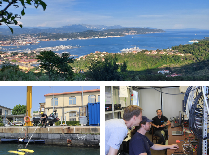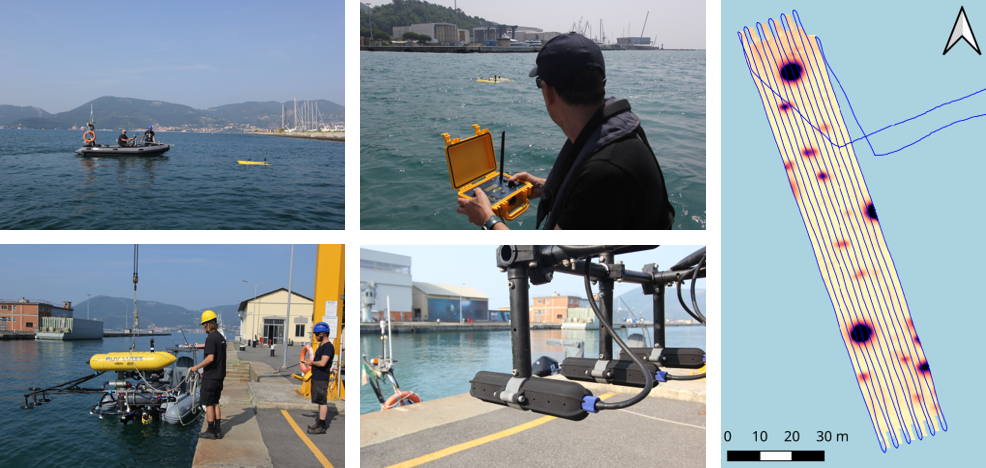 Two GEOMAR AUVs were involved during the survey in La Spezia, both manufactured by the Spanish company Iqua Robotics. The Girona 500 AUV Luise is equipped with magnetometers and a camera system, while the Sparus II AUV Albert is fitted with forward-looking and side-scan sonar. The Sparus II AUV was used to further develop GEOMAR’s acoustic techniques for detecting submerged munitions, while AUV Luise was deployed to map UXO using magnetic and photographic sensors in an entirely autonomous manner.