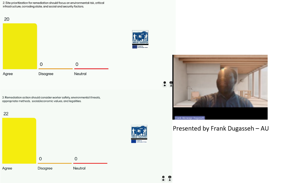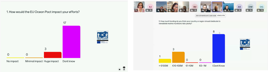 After the presentation of our findings and conclusions, the participants were asked to validate them by indicating whether they agreed or disagreed with the statements. This exercise was conducted with a Mentimeter questionnaire in the plenary room. After the exercise, the participants were divided by expertise into breakout groups to discuss in more detail some of the statements, especially those relevant to their expertise. After half an hour of small-group discussion, all participants returned to the plenum, where summaries from each breakout group were shared. The participants were then invited to respond to the second set of Mentimeter questions focused on the next phase of the stakeholder dialogues, specifically on how the implementation of the EU Ocean Pact may affect their activities and perspective on the appropriate level of funding to allocate to remediation efforts.